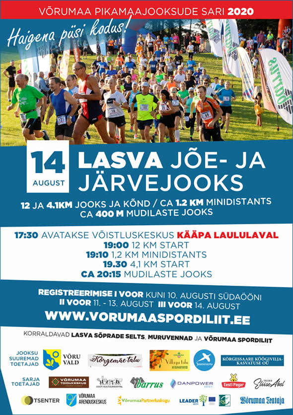 VI ETAPP / Reede, 14. august kell 19:00 7. LASVA JÕE- JA JÄRVEJOOKS – NB! võistluskeskus Kääpa laululaval / 12, 4.1 ja 1.2 km maastikul, kruusa- ja kergliiklusteel. Korraldaja: MTÜ Lasva sõprade selts ja Muruvennad.