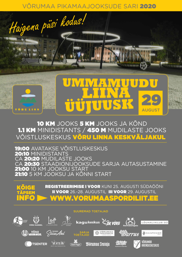 VII ETAPP / Laupäev, 29. august kell 21:00 4. UMMAMUUDU LIINA ÜÜJUUSK. Võistluskeskus Võru keskväljakul / 10, 5 ja 1.1 km valgustatud linnatänavtel ja kergliiklusteel. Korraldajad: Võrumaa Spordiliit, OK Võru ja Ekstreempark.