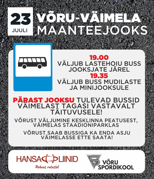 4,5 km jooksu start Võlsil kell 18:00, bussid starti väljuvad 17:30-17:40.