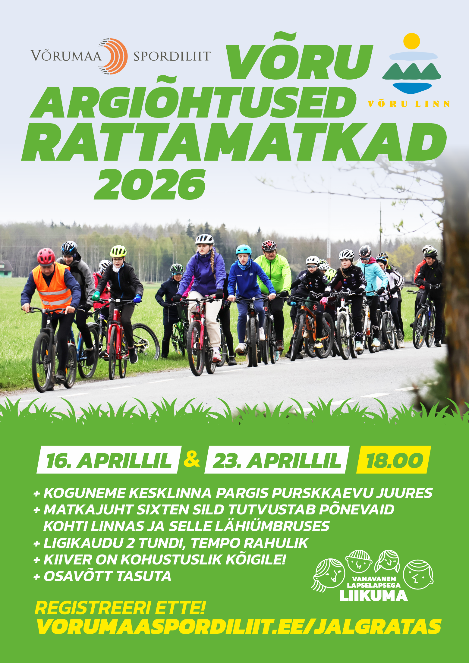 1. matk toimub neljapäeval, 24. aprillil. Koguneme kell 18:00 Võru Kesklinna pargis purskkaevu juures. Matkajuht Sixten Sild viib huvilised paaritunnilisele rattatiirule. Kiiver on kohustuslik! Osalemine on tasuta, kuid eelregamine väga oodatud.