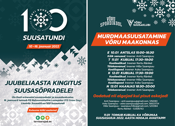 17:30 algavad Kubijal Võru Suusaklubi / Võru Spordikooli treenerite läbiviimisel Eesti Suusaliidu 100. sünnipäeva puhul toimuvad suusatunnid igas vanuses huvilistele! Lisainfo: www.suusaliit.ee Tundidesse eelregistreerimine pole vajalik. Varustust Kubijal ei laenutata, see tuleb endal kaasa võtta :)