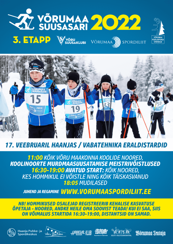 Võrumaa Suusasarja III etapp on natuke teistmoodi, sest hommikul kell 11:00 toimuvad Võru maakonna koolinoorte meistrivõistlused ning seal osalevate Võru maakonna koolide noorte tulemused lähevad arvesse kui III etapp (vanuseklassides samad distantsid). Kellel pole võimalik hommikul osaleda, saavad seda teha 16:30-19:00 avatud stardi ajal (õhtul sõidetud tulemused enam koolinoorte võistluse arvesse ei lähe). Ka kõik täiskasvanud on starti oodatud 16:30-19:00. Oma distantsi pikkuse leiab juhendist.
